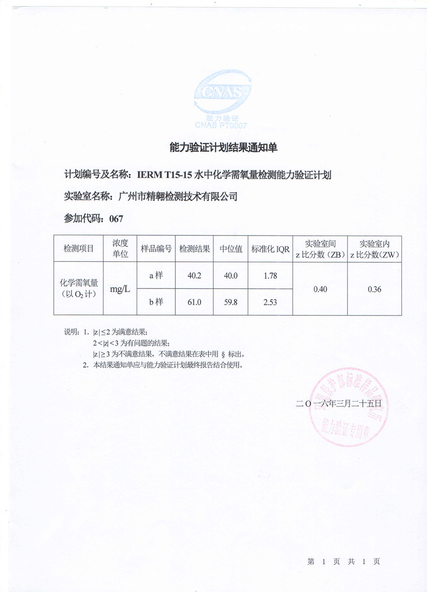 2015年12月,我司参加了环境保护部标准样品研究所组织的2015年度增补能力验证计划,并于2016年3月取得能力验证计划结果通知单,证明我司顺利通过该批次能力验证。