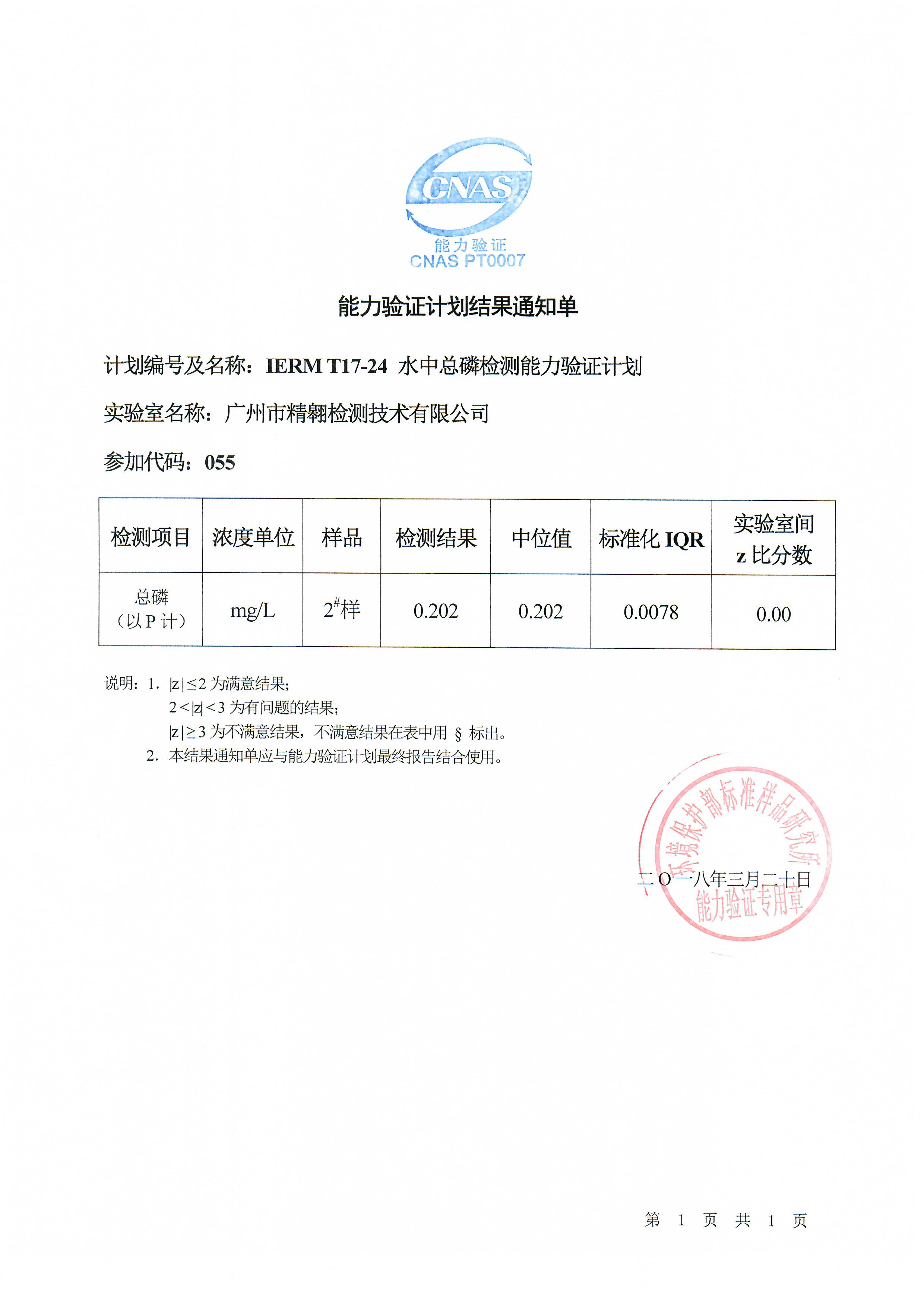 我司于2018年3月20日顺利通过水中总磷检测能力验证