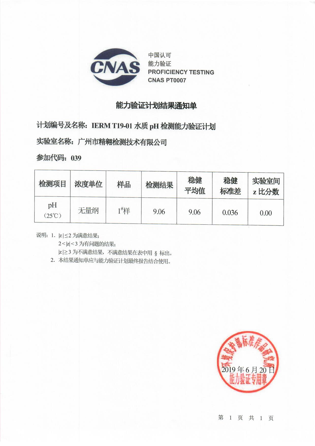 2019年6月我司通过水中化学需氧量、氨氮、pH值能力验证,结果满意